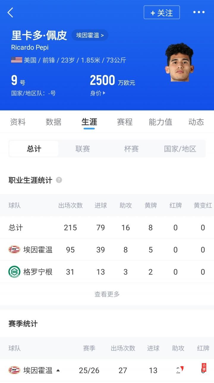 23岁美国前锋佩皮本赛季为埃因霍温出战27场比赛,贡献13球2助,德转身价2500万欧。